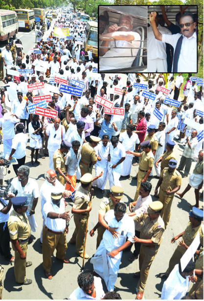 Protesters headed towards the Sterlite factory, intending to blockade it, but were stopped by platoons of police who mass arrested more than 2000 people including rally leaders Vaiko and Fatima Babu and leader of the Tamil Nadu Merchants Association – Vellaiyan. They were taken to private wedding halls where they were held for the rest of the day.