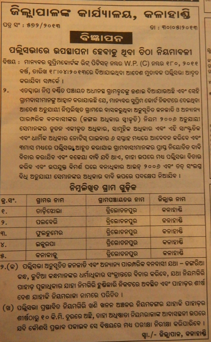 Under the Supreme Court Judgement writ petition no 180, year 2011, date 18/04/2013; regarding the Palli Sabha – hereby inhabitant villagers of the following panchayats are being notified and invited that, as per the orders of the Supreme Court, tribals and other forest dwellers, regarding their new individuals rights, community rights and cultural and religious rights under Forest Rights Act (FRA) rulings 2006 – after getting this notice they should apply within 6 weeks, and within 3 months Palli Sabha will be called and legal rights of the villagers will be decided. If they have any other demands, they will also be discussed in Palli Sabhas and after justified discussions, observing Forest Rights Act 2006 and its associated rulings their rights will be decided.