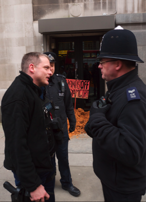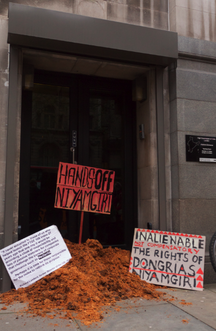 At the height of the demonstration three activists dressed as builders dumped a large pile of mud in front of the glass doors of the India High Commission, blocking the entrance and enraging the security guards. A sign stuck into the mud read ‘Hands off Niyamgiri’.