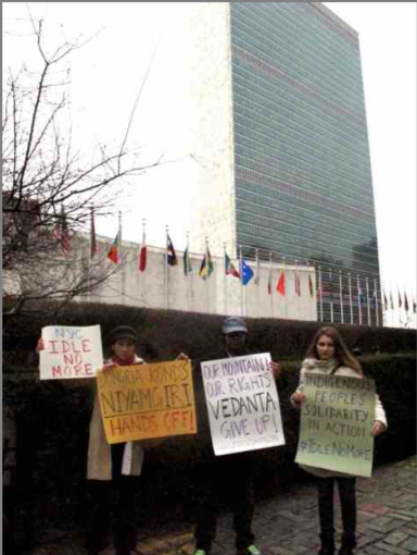 Meanwhile in New York activists rallied outside the United Nations Headquarterspointing out Vedanta’s violations of the UN Declaration on the Rights of Indigenous Peoples(4).