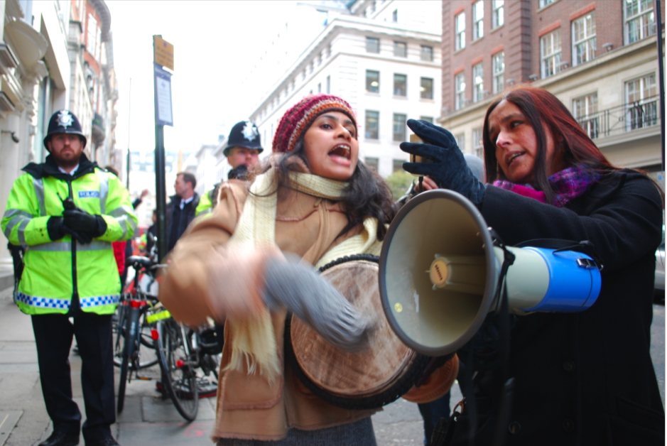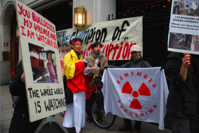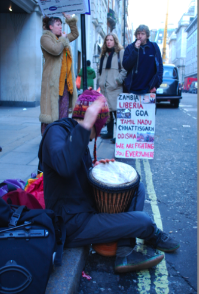 Protesters from a variety of grassroots groups (including Foil Vedanta, Phulbari Solidarity Group, South Asia Solidarity Group Japan Against Nuclear, Tamil Solidarity, National Committee of Bangladesh, Climate Justice Collective, the UK Committee to Protect Oil, Gas, Power-Port and Mineral Resources, Occupy London, World Development Movement and London Mining Network) gathered at Vedanta’s London headquarters today to add their voice to recent pressure for Vedanta to be de-listed from the London Stock Exchange for its poor corporate governance, illegal operations and major human rights violations.(1) They shouted ‘Vedanta out of London’ and blew horns and whistles. Several parliamentarians and the former CBI Director Richard LambertLondon have highlighted how Vedanta’s listing is used for legal immunity to hide their corporate crimes.(2)