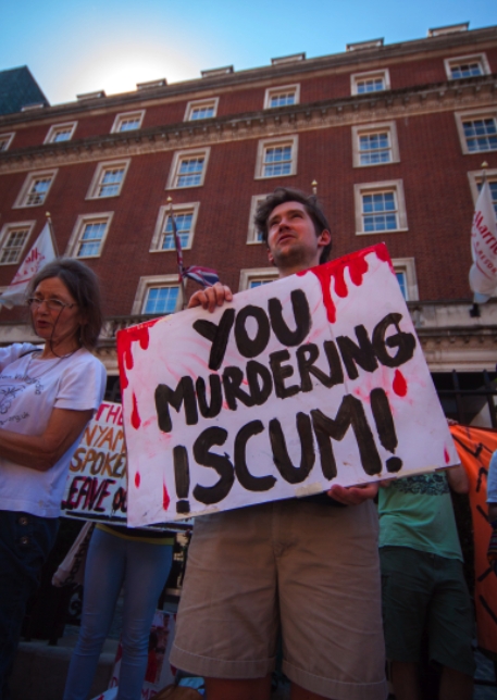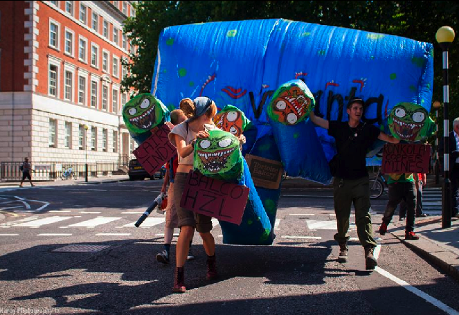 Vedanta’s London AGM was again disrupted today by protesters from Foil Vedanta and other organisations who raised a number of human rights concerns. Chanting and singing was continuous throughout the two hour protest and could be heard inside the AGM. Protesters held placards painted with defiant anti-company quotes from the Dongria Kond tribe in Odisha, India, where the company has been trying to mine illegally for ten years, and has now been stopped. Another group performed street theatre holding a giant inflatable monster with Vedanta Resources painted on it, and snake like heads bearing the names of Vedanta’s subsidiaries. Some Sri Lankan protesters played Parai drums (a Tamil drum of revolution) outside the Mayfair venue. Vedanta subsidiary Cairn India is drilling in the fragile Mannar basin off Sri Lanka. At the peak of the protests a sit in was staged as the Vedanta monster was used to block the road.